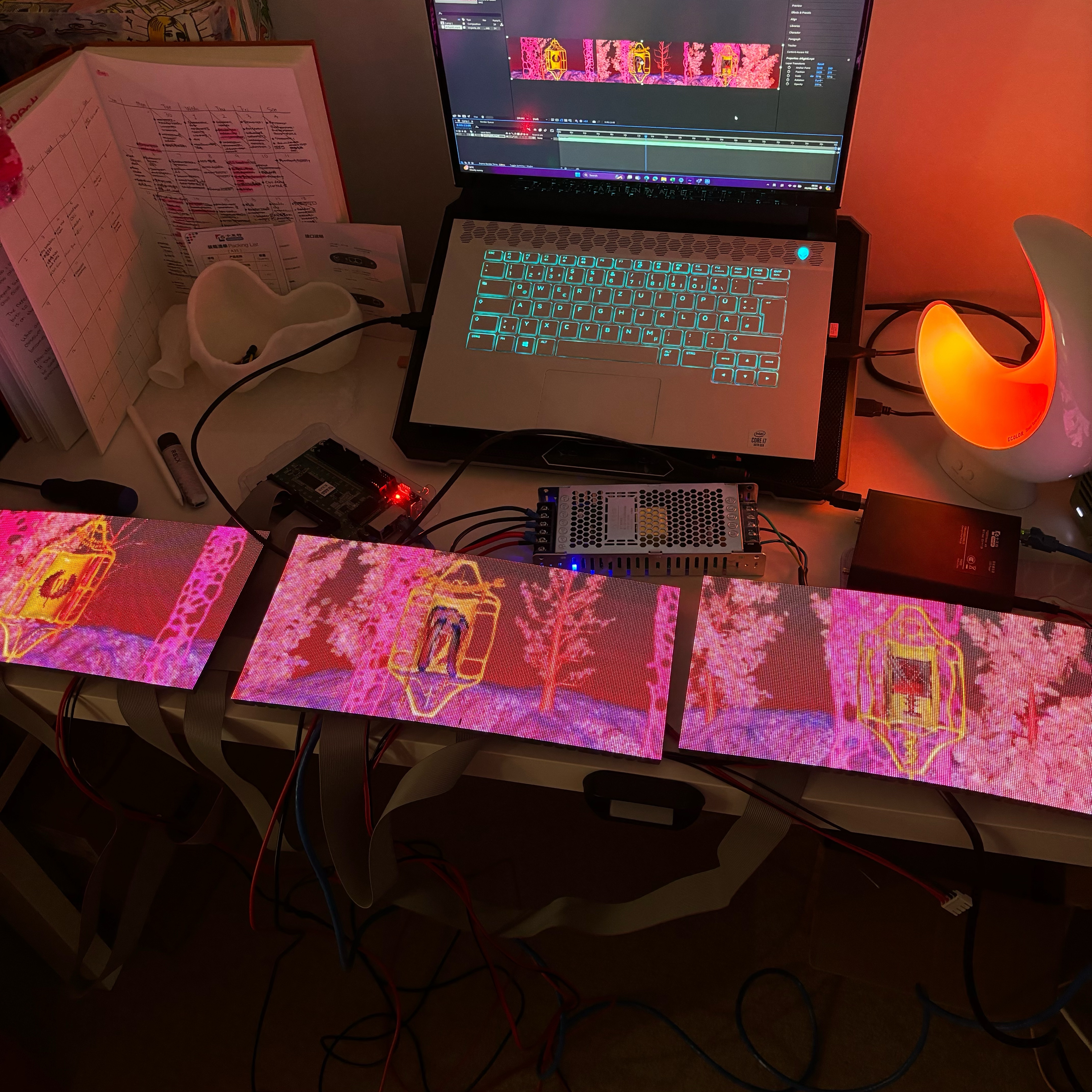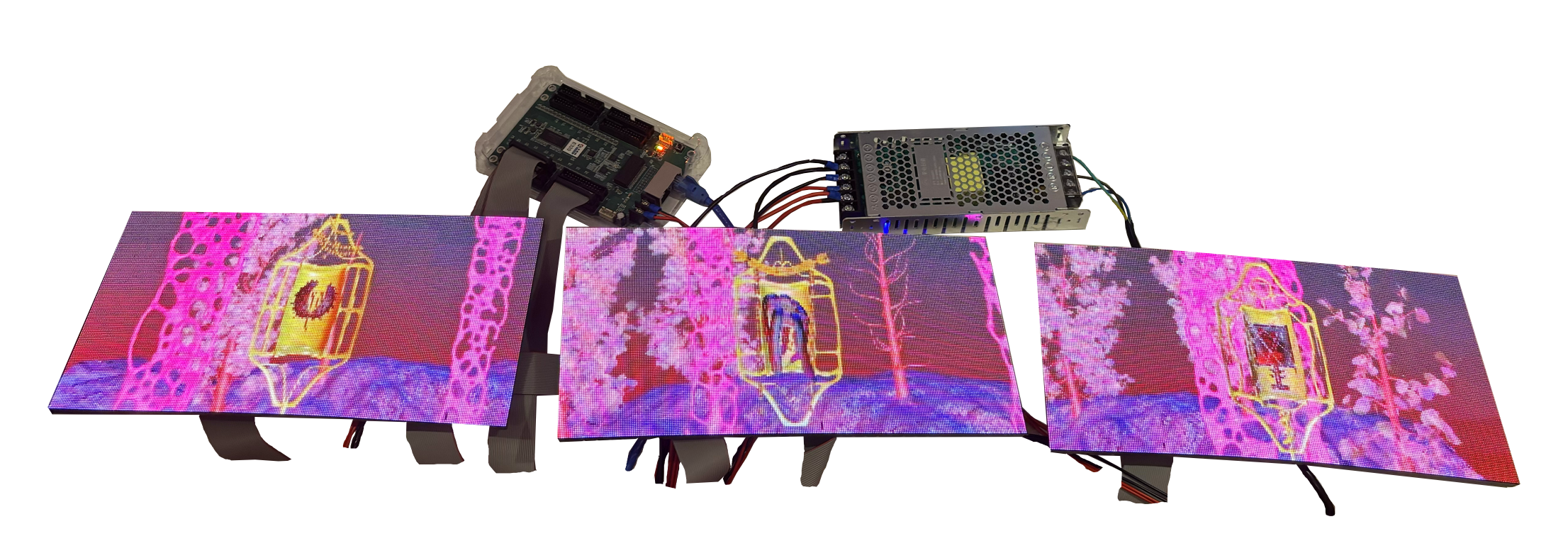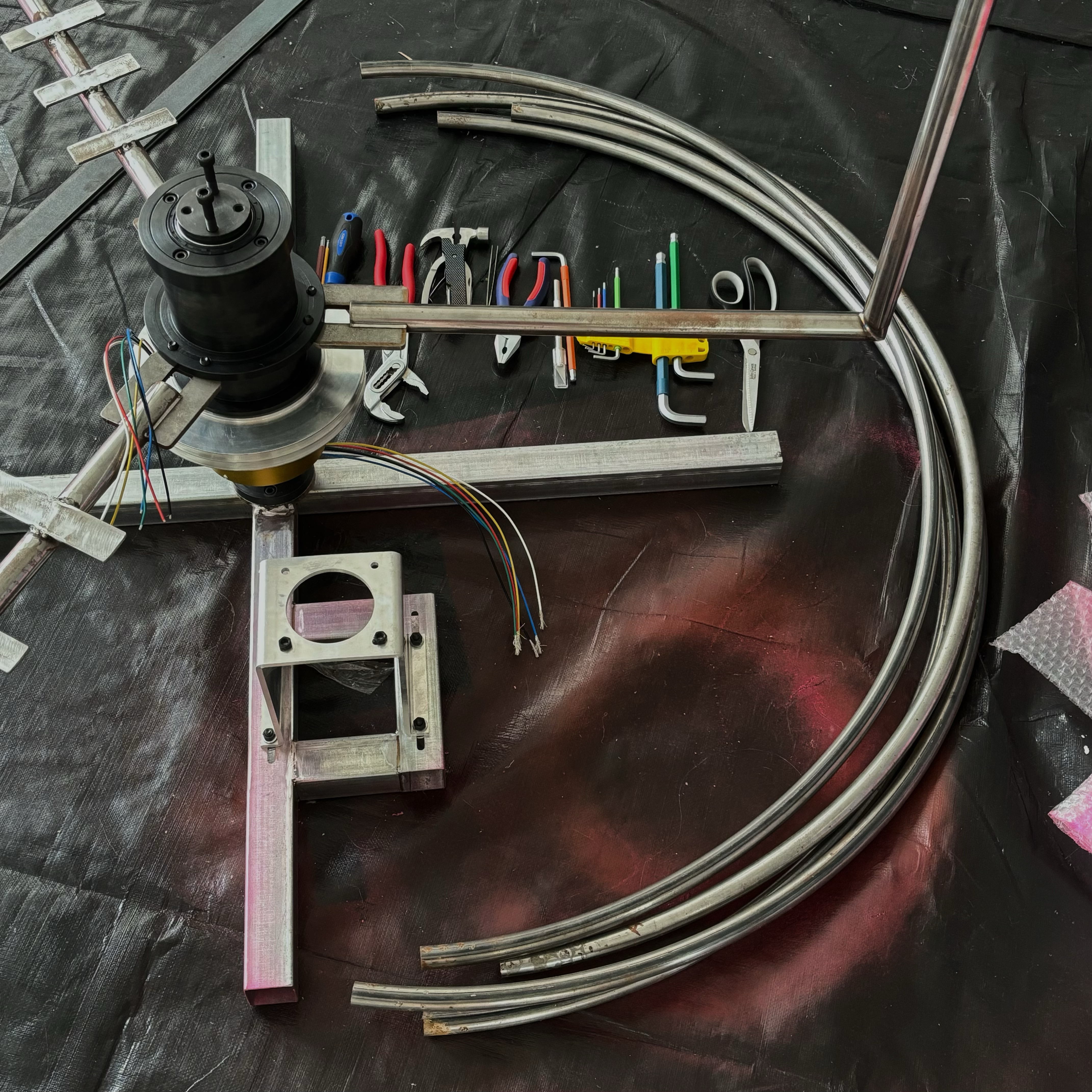 The rotating structure of the device is CNC-machined and supported by a welded carbon-steel frame. Carbon steel and aluminium are used throughout the installation. Screens are mounted magnetically on the metal framework. Data and 5V power cables run along the structure, connecting to the transformer and the control unit. A central motor drives rotation through a slip ring, enabling continuous 360-degree movement.