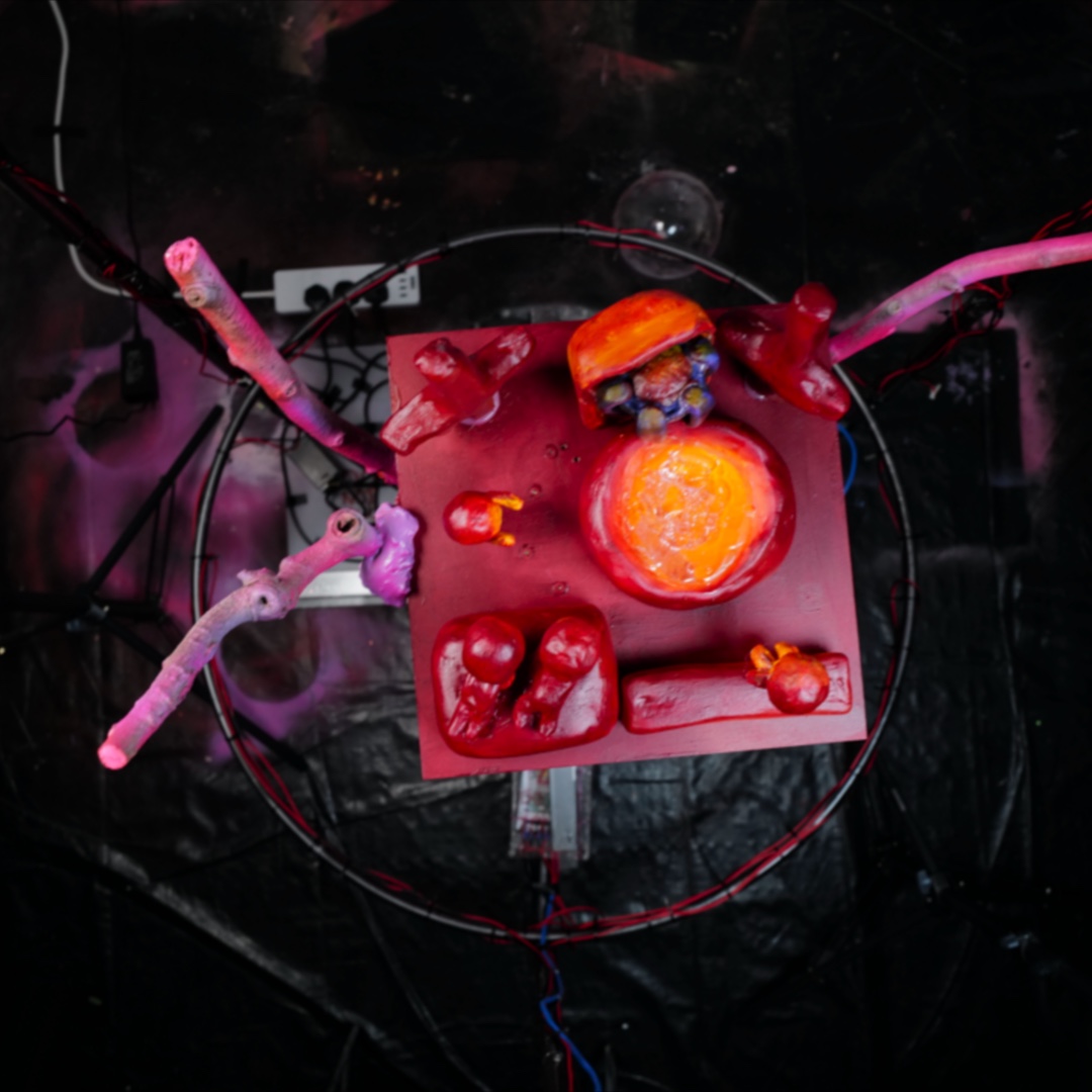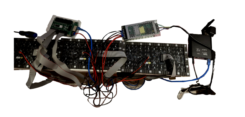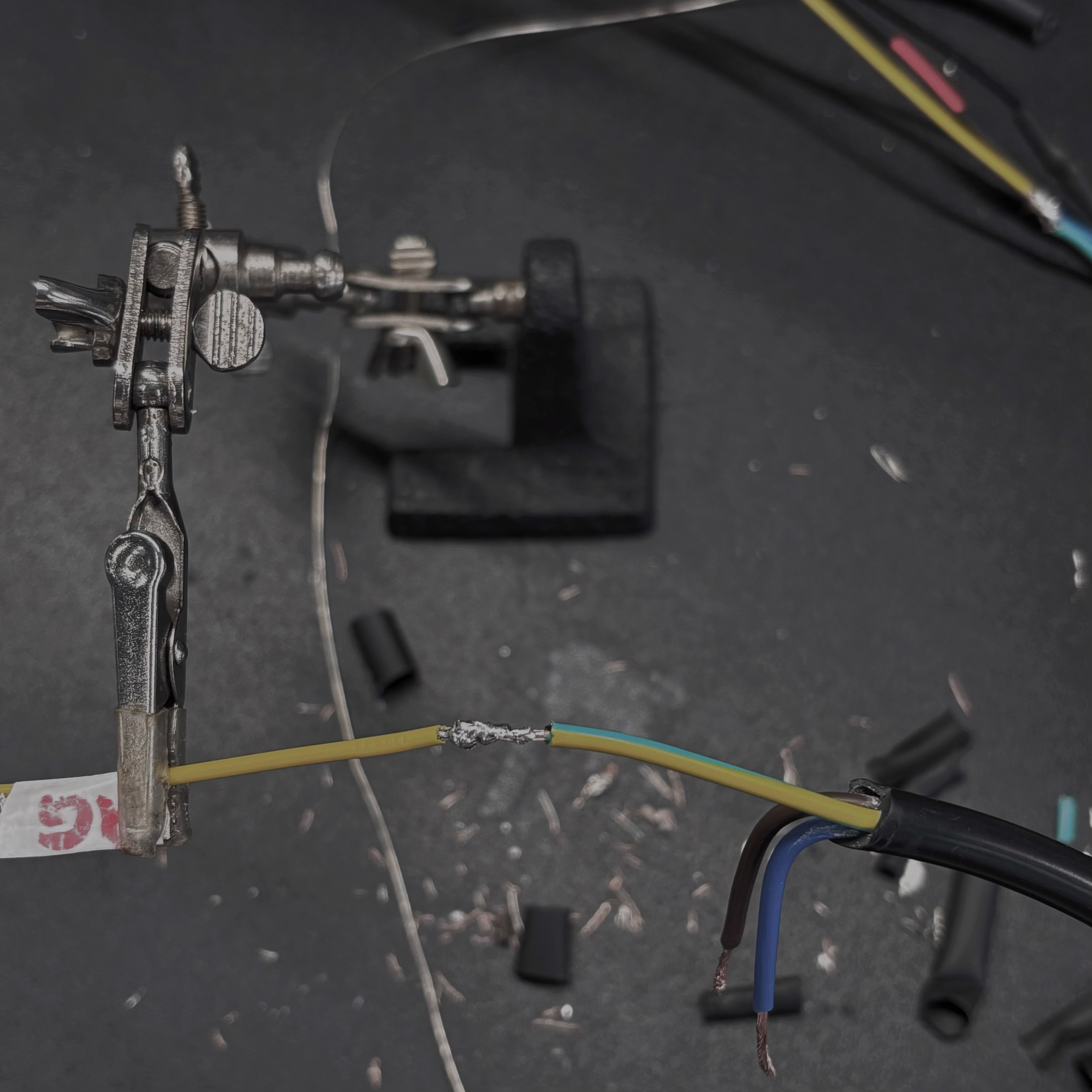 The rotating structure of the device is CNC-machined and supported by a welded carbon-steel frame. Carbon steel and aluminium are used throughout the installation. Screens are mounted magnetically on the metal framework. Data and 5V power cables run along the structure, connecting to the transformer and the control unit. A central motor drives rotation through a slip ring, enabling continuous 360-degree movement.